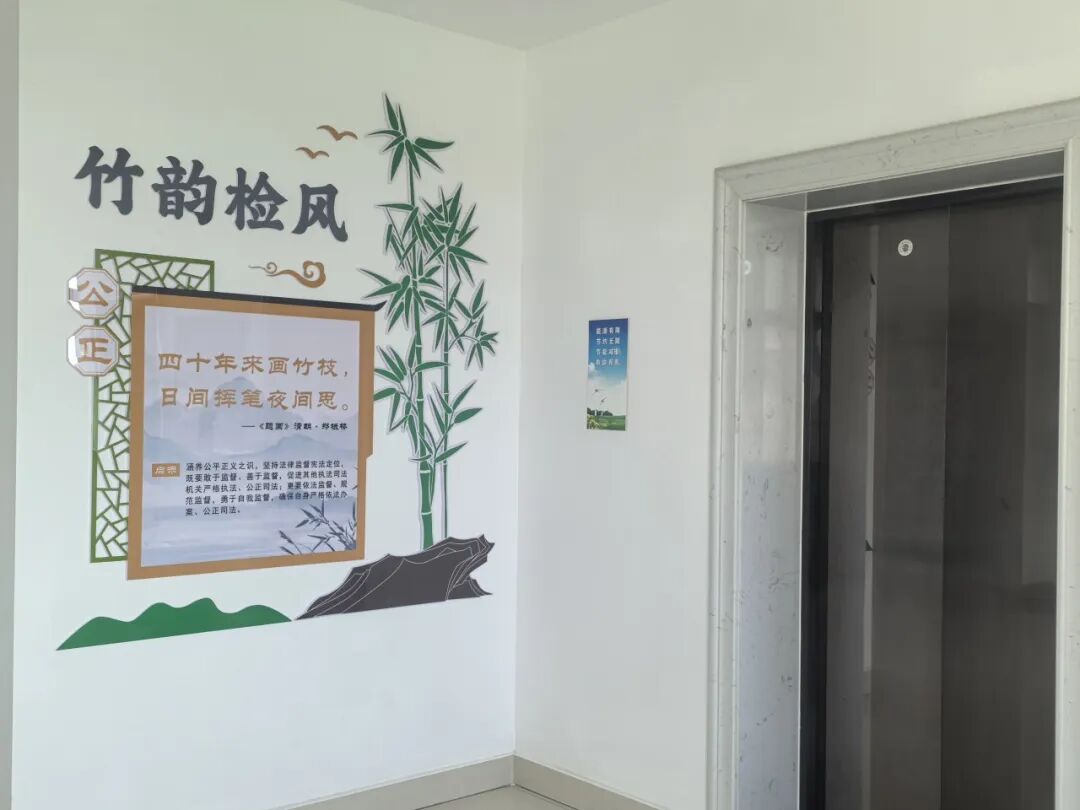 在院史陈列中心,板桥开仓放粮木板画、竹石图生动再现先贤以民为本的理念,与“为人民服务”遥相呼应;办公区域、醒目位置随处可见板桥竹石版画、文化墙、竹石屏风等设计;80多幅廉政书画作品分散在各楼层,点缀其间;廉政文化走廊延伸,形成步步有景、景中寓教的文化动线;“凌云竹”法学社定期开展法学研讨,在全院范围内积极营造板桥文化氛围,以润物无声的文化熏陶铭心励志,让新时代检察精神在举手投足间入脑入心更入行。
