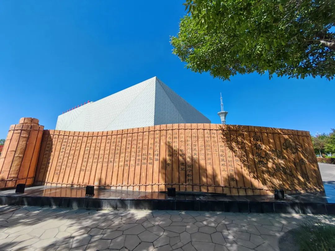 离我住的宿舍大约两公里处,有一座很漂亮的白色几何形建筑,这便是第七师胡杨河市文化馆,在场馆前面是一棵胡杨树的雕塑,旁边还有一面石雕,正面书写着“热爱祖国,无私奉献,艰苦创业,开拓进取”十六个大字,背面就是石星光那首脍炙人口的诗歌《胡杨礼赞》:“穿越了宇宙洪荒,凝练了天地玄黄,胡杨林作为最早的植物群落,在这个幸运的星球上,神奇地创造了生命的绿色和希望,饱经了岁月沧桑,习惯了世态炎凉,胡杨林成为最后的留守物种,在这个严酷的环境里,精辟地诠释了生存的价值和力量……”