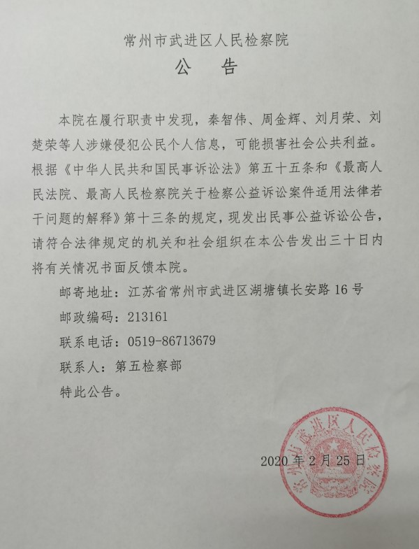 本院在履行职责中发现,秦智伟、周金辉、刘月荣、刘楚荣等人涉嫌侵犯公民个人信息,可能损害社会公共利益。根据《中华人民共和国民事诉讼法》第五十五条和《最高人民法院、最高人民检察院关于检察公益诉讼案件适用法律若干问题的解释》第十三条的规定,现发出民事公益诉讼公告,请符合法律规定的机关和社会组织在本公告发出三十日内将有关情况书面反馈本院。
