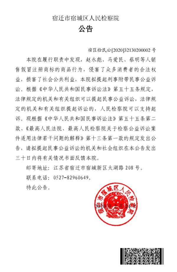 本院在履行职责中发现,赵永彪、马爱民、蔡明等人销售假冒注册商标的商品行为,侵害了众多消费者的合法权益,损害了社会公共利益,本院拟提起刑事附带民事公益诉讼。根据《中华人民共和国民事诉讼法》第五十五条规定,法律规定的机关和有关组织可以提起民事公益诉讼,法律规定的机关和有关组织提起诉讼的,人民检察院可以支持起诉。现根据《中华人民共和国民事诉讼法》第五十五条第二款、《最高人民法院、最高人民检察院关于检察公益诉讼案件适用法律若干问题的解释》第十三条第一款的规定发出公告,请拟提起民事公益诉讼的机关和社会组织在本公告发出三十日内将有关情况书面反馈本院。