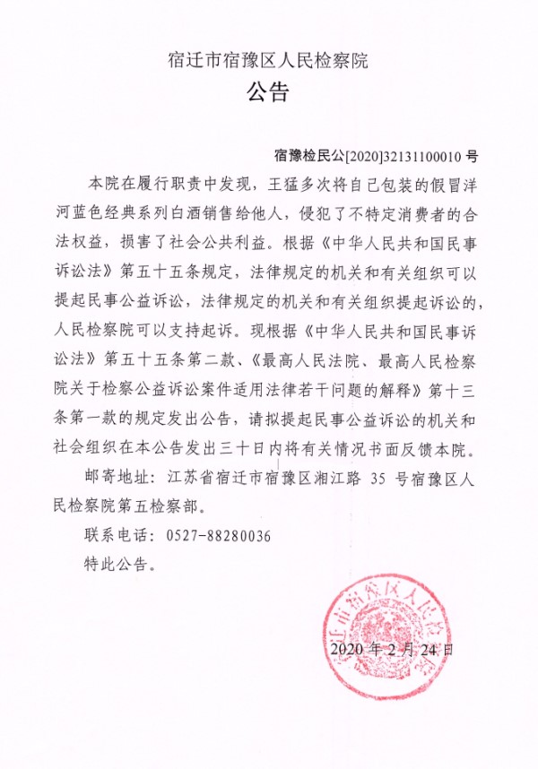 本院在履行职责中发现,王猛多次将自己包装的假冒洋河蓝色经典系列白酒销售给他人,侵犯了不特定消费者的合法权益,损害了社会公共利益。根据《中华人民共和国民事诉讼法》第五十五条规定,法律规定的机关和有关组织可以提起民事公益诉讼,法律规定的机关和有关组织提起诉讼的,人民检察院可以支持起诉。现根据《中华人民共和国民事诉讼法》第五十五条第二款、《最高人民法院、最高人民检察院关于检察公益诉讼案件适用法律若干问题的解释》第十三条第一款的规定发出公告,请拟提起民事公益诉讼的机关和社会组织在本公告发出三十日内将有关情况书面反馈本院。