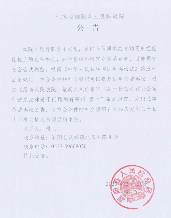 本院在履行职责中发现,葛以立伙同单红青购买未经检验检疫的走私牛肉,并销售给不特定众多消费者,可能损害社会公共利益。根据《中华人民共和国民事诉讼法》第五十五条规定,符合条件的社会组织可以提起民事公益诉讼。根据《最高人民法院、最高人民检察院〈关于检察公益诉讼案件适用法律若干问题的解释〉》第十三条之规定,发出民事公益诉讼公告,请符合条件的社会组织在本公告发出三十日内将有关情况书面反馈本院。