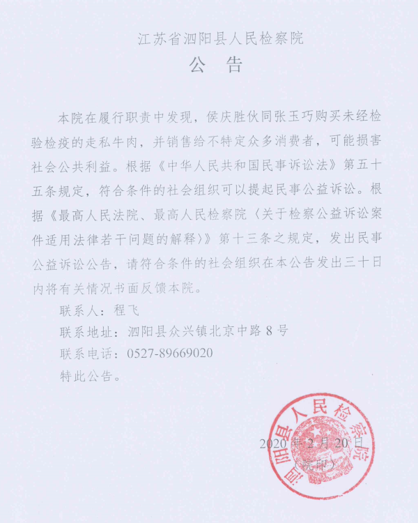 本院在履行职责中发现,侯庆胜伙同张玉巧购买未经检验检疫的走私牛肉,并销售给不特定众多消费者,可能损害社会公共利益。根据《中华人民共和国民事诉讼法》第五十五条规定,符合条件的社会组织可以提起民事公益诉讼。根据《最高人民法院、最高人民检察院〈关于检察公益诉讼案件适用法律若干问题的解释〉》第十三条之规定,发出民事公益诉讼公告,请符合条件的社会组织在本公告发出三十日内将有关情况书面反馈本院。