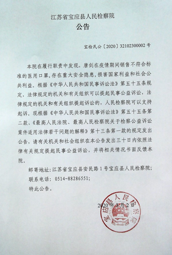 本院在履行职责中发现,唐剑在疫情期间销售不符合标准医用的口罩,存在重大安全隐患,损害国家利益和社会公共利益。根据《中华人民共和国民事诉讼法》第五十五条规定,法律规定的机关和有关组织可以提起民事公益诉讼,法律规定的机关和有关组织提起诉讼的,人民检察院可以支持起诉。现根据《中华人民共和国民事诉讼法》第五十五条第二款、《最高人民法院、最高人民检察院关于检察公益诉讼案件适用法律若干问题的解释》第十三条第一款的规定发出公告,请有关机关和社会组织在本公告发出三十日内依照法律有关规定提起民事公益诉讼,并将相关情况书面反馈本院。