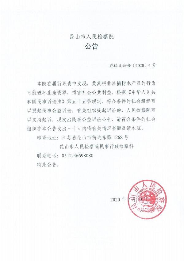 本院在履行职责中发现,黄其根非法捕捞水产品的行为可能破坏生态资源,损害社会公共利益。根据《中华人民共和国民事诉讼法》第五十五条规定,符合条件的社会组织可以提起民事公益诉讼。有关组织提起诉讼的,人民检察院可以支持起诉。现发出民事公益诉讼公告,请符合条件的社会组织在本公告发出三十日内将有关情况书面反馈本院。