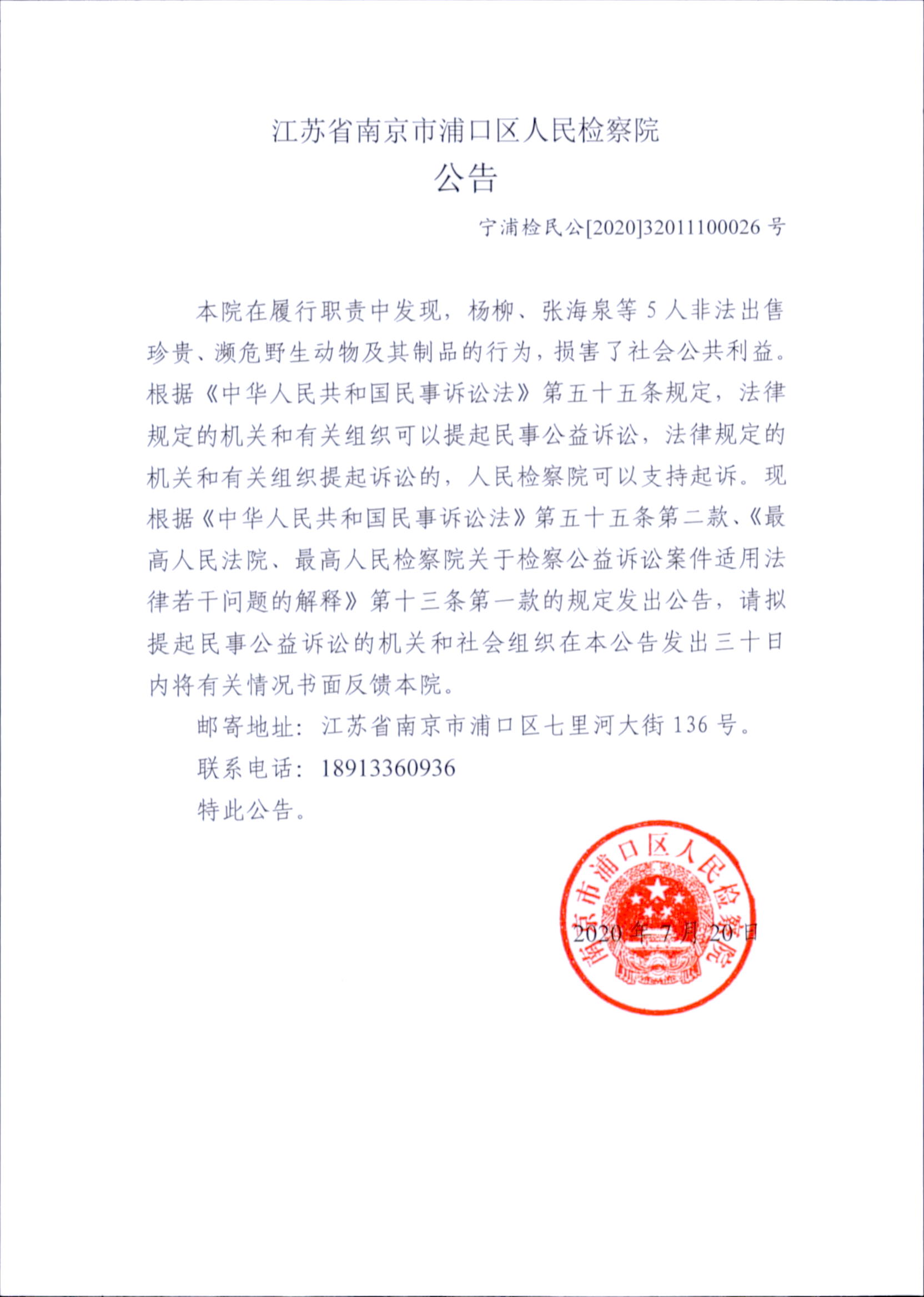 本院在履行职责中发现,杨柳、张海泉等5人非法出售珍贵、濒危野生动物及其制品的行为,损害了社会公共利益。根据《中华人民共和国民事诉讼法》第五十五条规定,法律规定的机关和有关组织可以提起民事公益诉讼,法律规定的机关和有关组织提起诉讼的,人民检察院可以支持起诉。现根据《中华人民共和国民事诉讼法》第五十五条第二款、《最高人民法院、最高人民检察院关于检察公益诉讼案件适用法律若干问题的解释》第十三条第一款的规定发出公告,请拟提起民事公益诉讼的机关和社会组织在本公告发出三十日内将有关情况书面反馈本院。