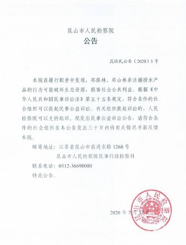 本院在履行职责中发现,郑保林、郑山林非法捕捞水产品的行为可能破坏生态资源,损害社会公共利益。根据《中华人民共和国民事诉讼法》第五十五条规定,符合条件的社会组织可以提起民事公益诉讼。有关组织提起诉讼的人民检察院可以支持起诉。现发出民事公益诉讼公告,请符合条件的社会组织在本公告发出三十日内将有关情况书面反馈本院。