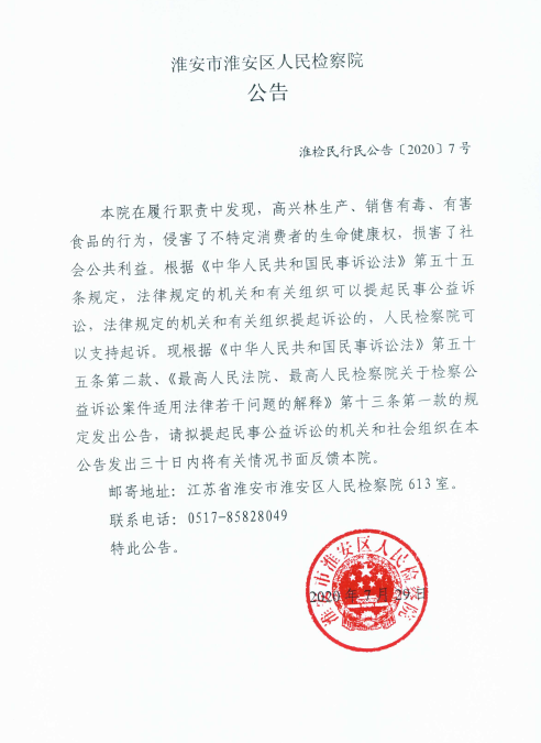 本院在履行职责中发现,高兴林生产、销售有毒、有害食品的行为,侵害了不特定消费者的生命健康权,损害了社会公共利益。根据《中华人民共和国民事诉讼法》第五十五条规定,法律规定的机关和有关组织可以提起民事公益诉讼,法律规定的机关和有关组织提起诉讼的,人民检察院可以支持起诉。现根据《中华人民共和国民事诉讼法》第五十五条第二款、《最高人民法院、最高人民检察院关于检察公益诉讼案件适用法律若干问题的解释》第十三条第一款的规定发出公告,请拟提起民事公益诉讼的机关和社会组织在本公告发出三十日内将有关情况书面反馈本院。