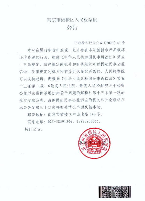 本院在履行职责中发现,张永存在非法捕捞水产品破坏环境资源的行为。根据《中华人民共和国民事诉讼法》第五十五条规定,法律规定的机关和有关组织可以提起民事公益诉讼,法律规定的机关和有关组织提起诉讼的,人民检察院可以支持起诉。现根据《中华人民共和国民事诉讼法》第五十五条第二款、《最高人民法院、最高人民检察院关于检察公益诉讼案件适用法律若干问题的解释》第十三条第一款的规定发出公告,请拟提起民事公益诉讼的机关和社会组织在本公告发出三十日内将有关情况书面反馈本院。