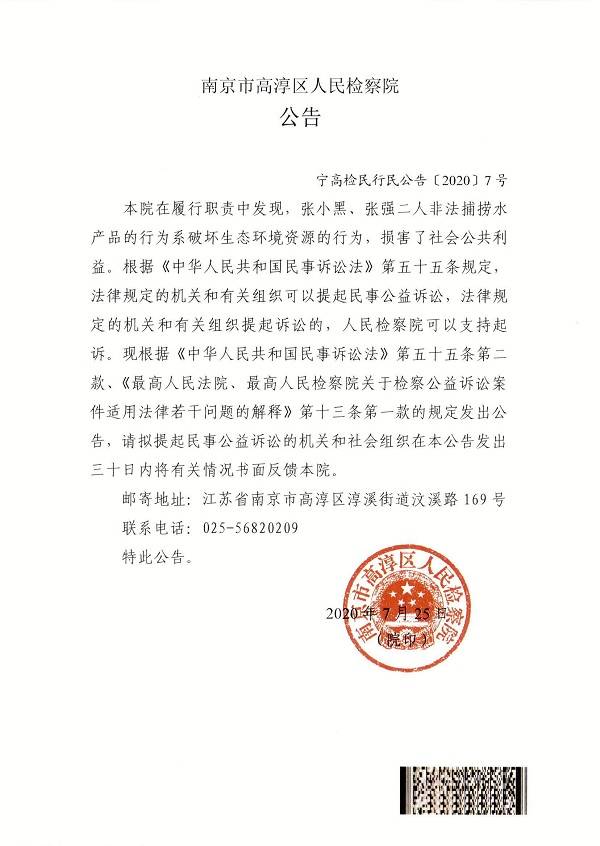 本院在履行职责中发现,张小黑、张强二人非法捕捞水产品的行为系破坏生态环境资源的行为,损害了社会公共利益。根据《中华人民共和国民事诉讼法》第五十五条规定,法律规定的机关和有关组织可以提起民事公益诉讼,法律规定的机关和有关组织提起诉讼的,人民检察院可以支持起诉。现根据《中华人民共和国民事诉讼法》第五十五条第二款、《最高人民法院、最高人民检察院关于检察公益诉讼案件适用法律若干问题的解释》第十三条第一款的规定发出公告,请拟提起民事公益诉讼的机关和社会组织在本公告发出三十日内将有关情况书面反馈本院。