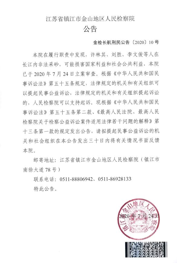 本院在履行职责中发现,许林其、刘胜、李文俊等人在长江内非法采砂,可能损害国家利益和社会公共利益,本院已于2020年7月24日立案审查。根据《中华人民共和国民事诉讼法》第五十五条规定,法律规定的机关和有关组织可以提起民事公益诉讼,法律规定的机关和有关组织提起诉讼的,人民检察院可以支持起诉。现根据《中华人民共和国民事诉讼法》第五十五条第二款、《最高人民法院、最高人民检察院关于检察公益诉讼案件适用法律若干问题的解释》第十三条第一款的规定发出公告,请拟提起民事公益诉讼的机关和社会组织在本公告发出三十日内将有关情况书面反馈本院。