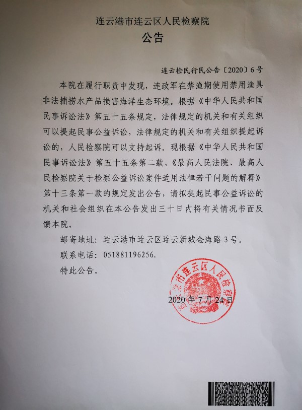 本院在履行职责中发现,连政军在禁渔期使用禁用渔具非法捕捞水产品损害海洋生态环境。根据《中华人民共和国民事诉讼法》第五十五条规定,法律规定的机关和有关组织可以提起民事公益诉讼,法律规定的机关和有关组织提起诉讼的,人民检察院可以支持起诉。现根据《中华人民共和国民事诉讼法》第五十五条第二款、《最高人民法院、最高人民检察院关于检察公益诉讼案件适用法律若干问题的解释》第十三条第一款的规定发出公告,请拟提起民事公益诉讼的机关和社会组织在本公告发出三十日内将有关情况书面反馈本院。