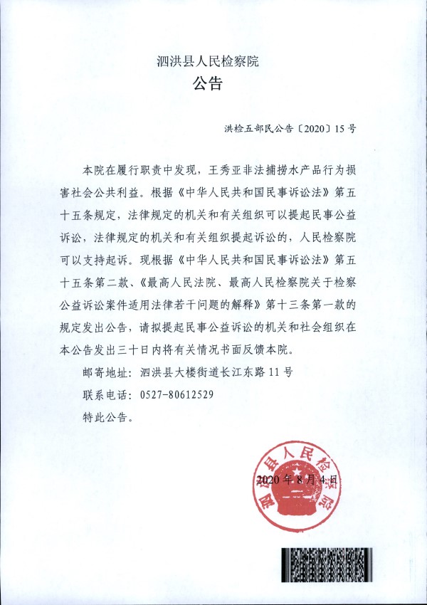 本院在履行职责中发现,王秀亚非法捕捞水产品行为损害社会公共利益。根据《中华人民共和国民事诉讼法》第五十五条规定,法律规定的机关和有关组织可以提起民事公益诉讼,法律规定的机关和有关组织提起诉讼的,人民检察院可以支持起诉。现根据《中华人民共和国民事诉讼法》第五十五条第二款、《最高人民法院、最高人民检察院关于检察公益诉讼案件适用法律若干问题的解释》第十三条第一款的规定发出公告,请拟提起民事公益诉讼的机关和社会组织在本公告发出三十日内将有关情况书面反馈本院。