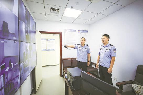 刘红波(左)指导新入职司法警察查看监控。