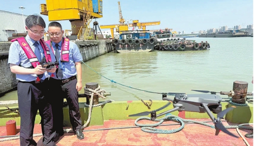 2025年7月,江苏省无锡市梁溪区检察院检察官刘培培(右)指导青年干警运用无人机等技术开展大运河“巡河”工作。