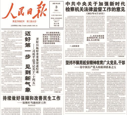 《人民日报》刊发《中共中央关于加强新时代检察机关法律监督工作的意见》