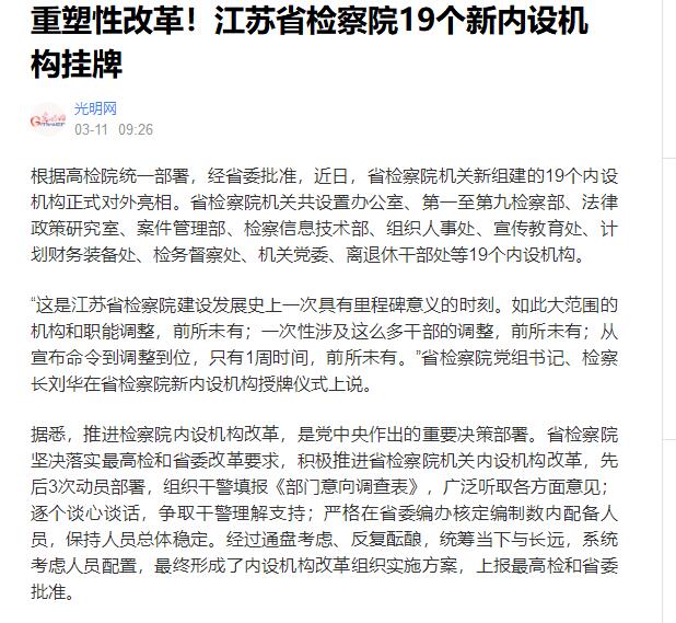 光明网:重塑性改革!江苏省检察院19个新内设机构挂牌