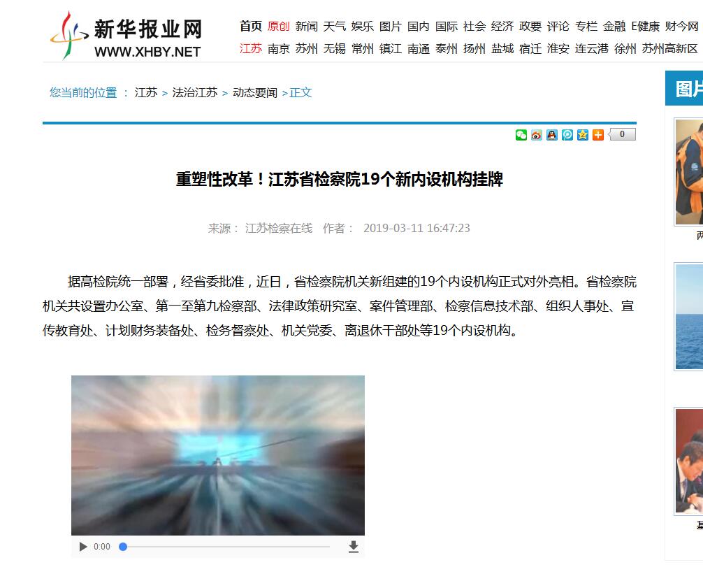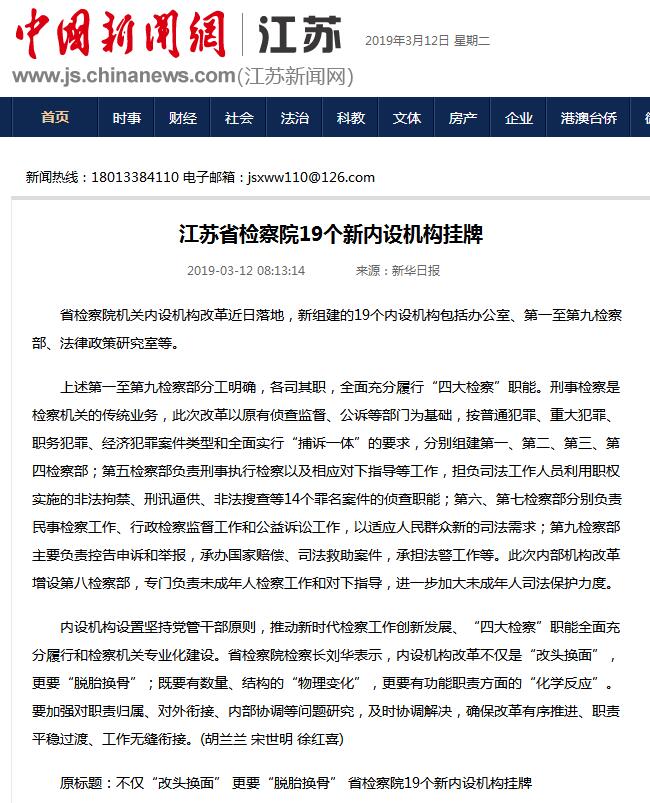 中国新闻网江苏频道:重塑性改革!江苏省检察院19个新内设机构挂牌