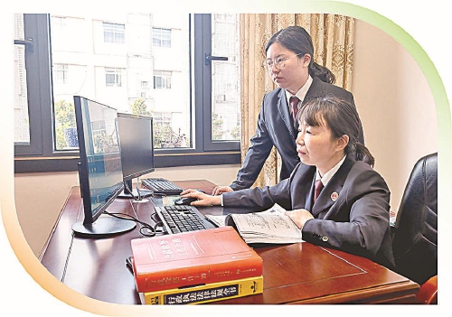 丹阳(前)和同事查阅相关法律条文。