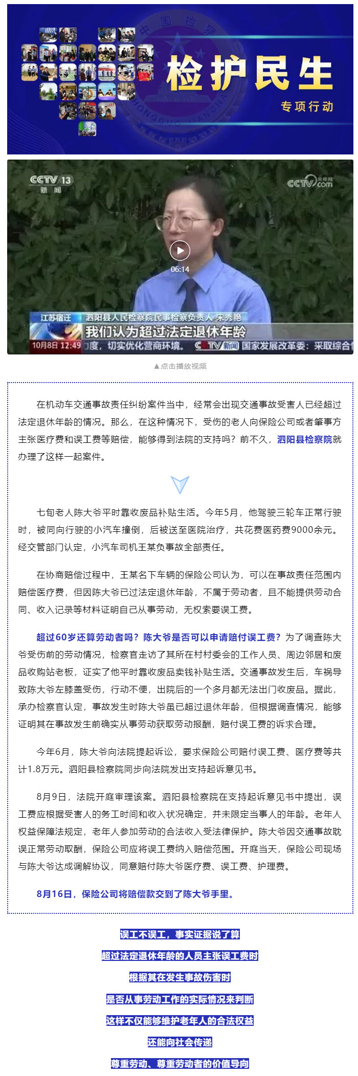 超过60岁的陈大爷是否可以申请赔付误工费?泗阳县检察官以案释法→