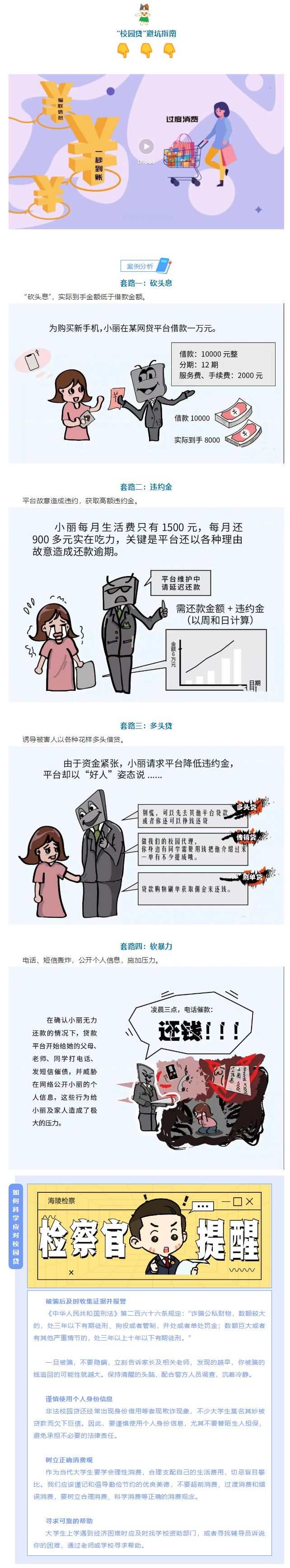 江苏省泰州市海陵区检察官在办理了一系列“校园贷”的极端案例后,觉得有必要提醒一下即将进入大学的萌新们:开学季是校园一年中最热闹的时段,也是大一新生被骗被盗的高发期,精心蓄谋的各种骗局在悄悄酝酿,容易陷入到校园贷的骗局。