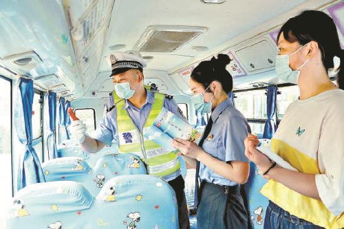 今年8月以来,江苏省灌云县检察院联合该县公安、交通部门对辖区内所有校车的车况、防护设施、防疫措施、车载消防救援设备等进行专项安全检查,及时排除隐患,确保学生乘车安全。图为8月30日,该院检察官联合公安民警对校车进行安全检查。本报通讯员 吴晨光 高兵 摄