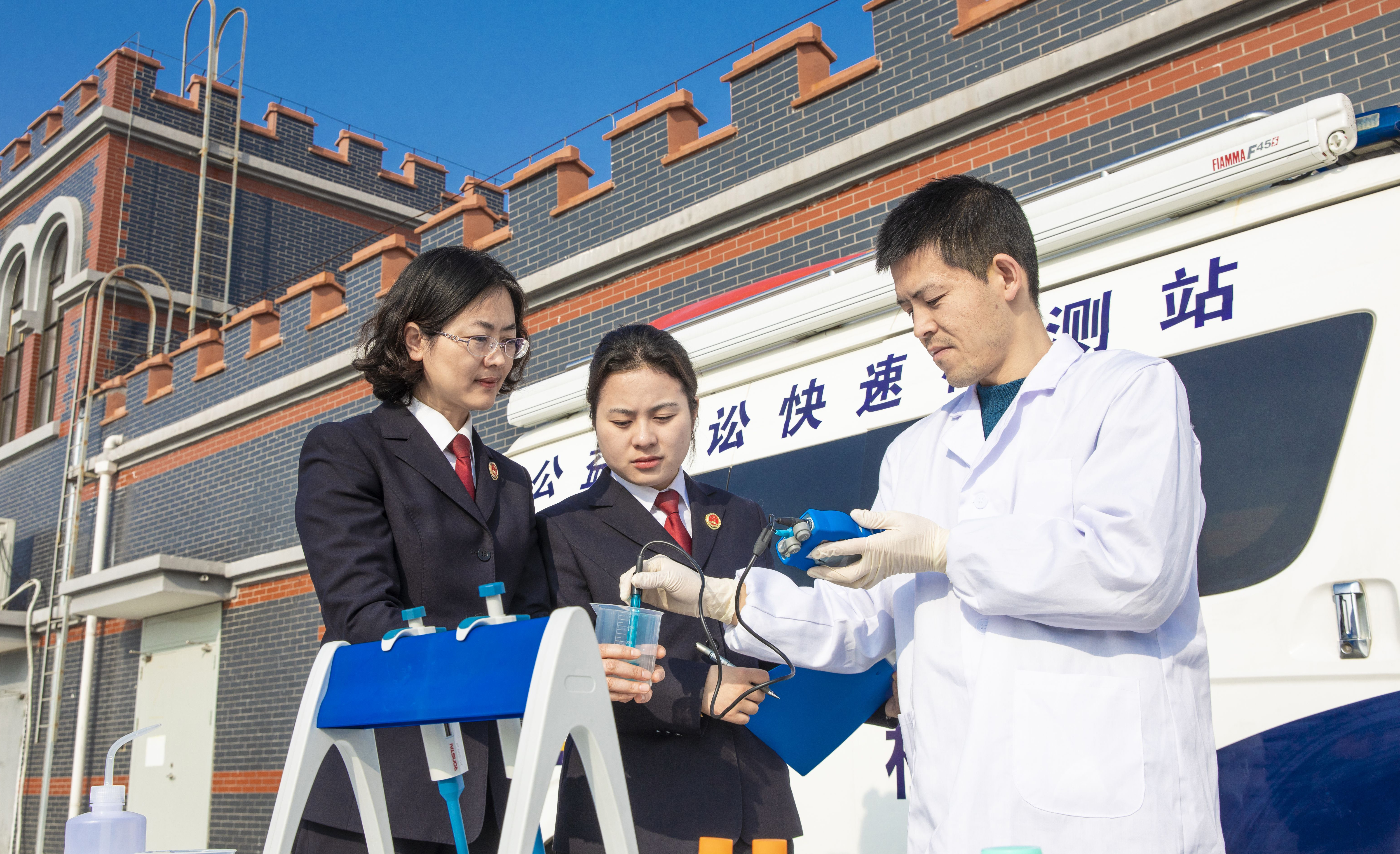 12月10日,江苏省淮安市、涟水县两级检察院联合开展保障饮用水安全专项行动,将公益诉讼快速检测车开到自来水公司取水口,检察技术人员通过无人机对现场取水口上游环境巡查,现场检测水体取样、水质电导率、溶解氧等指标。