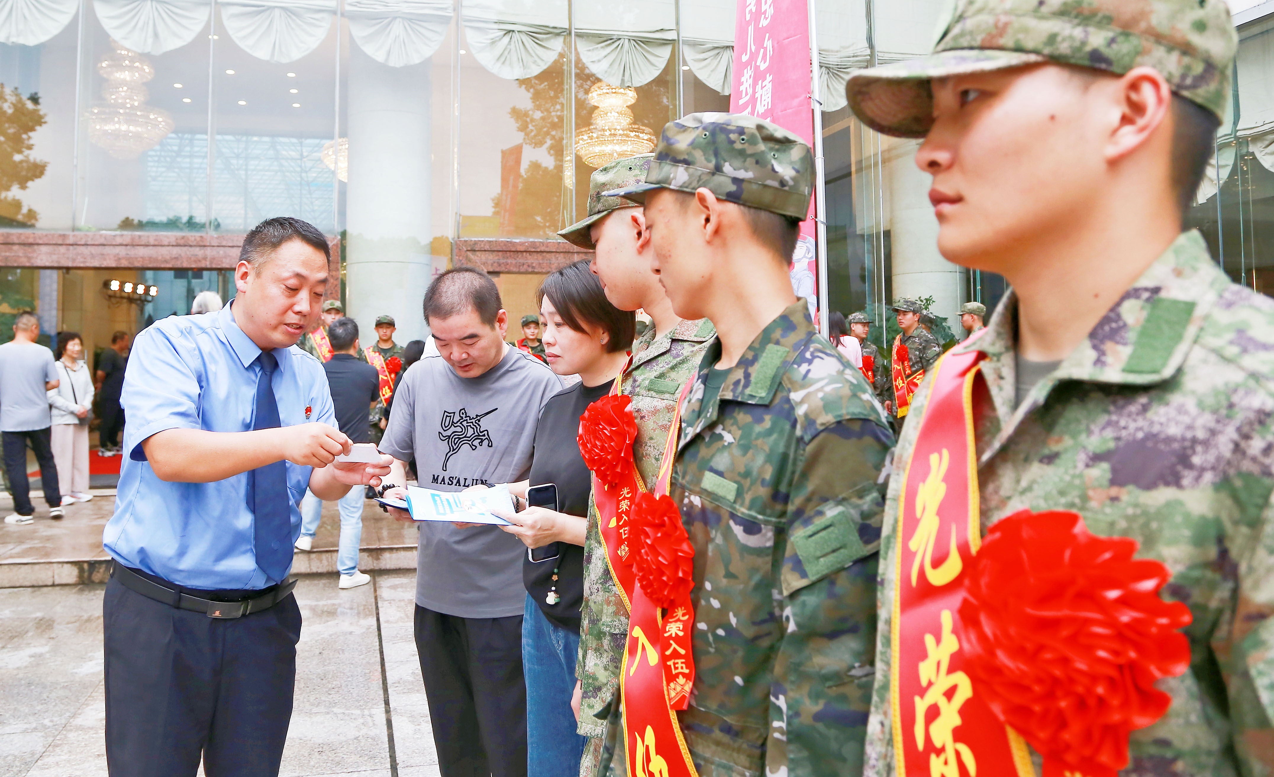9月15日,江苏省镇江市丹徒区检察院“检与同行”法律服务队在新兵欢送会现场,为42名丹徒籍新战士宣传网络安全知识,赠送法治拥军联系卡等“法治伴手礼”。 □通讯员 王运喜 李青妍 摄