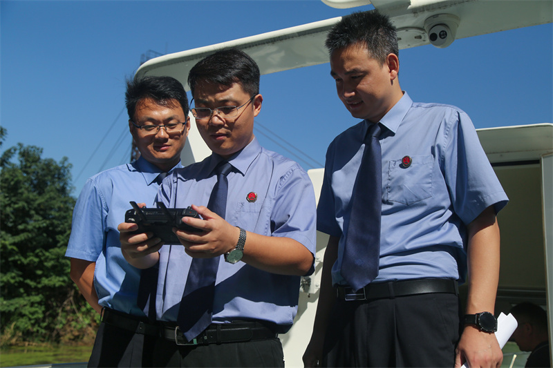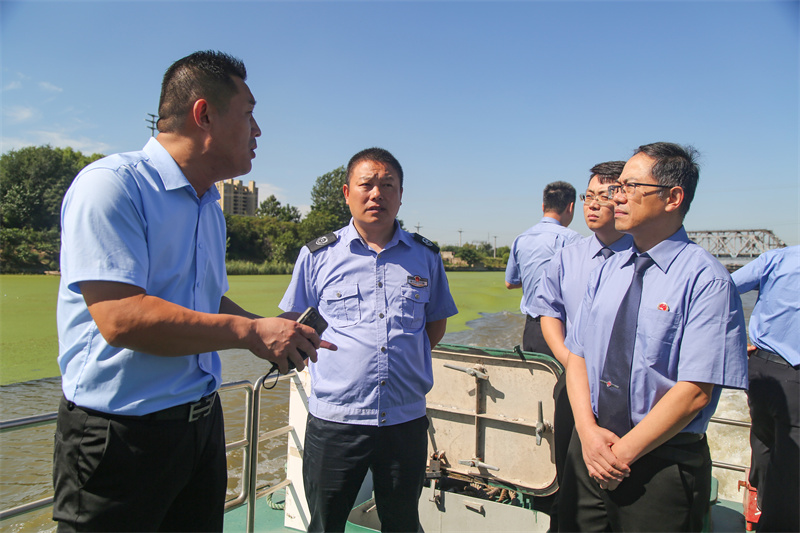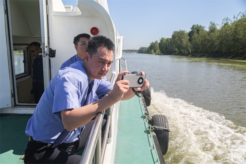 巡河组乘船沿运河堤防向上游、下游巡查,通过实地踏查、现场走访、无人机勘探等方式对生态环境保护情况、存在问题进行全面巡查。经现场调查发现,大运河经开区一些河段存在浮萍泛滥、生活垃圾漂浮、拦网捕鱼等破坏水环境水生态问题和侵占堤防保护区等违法行为。