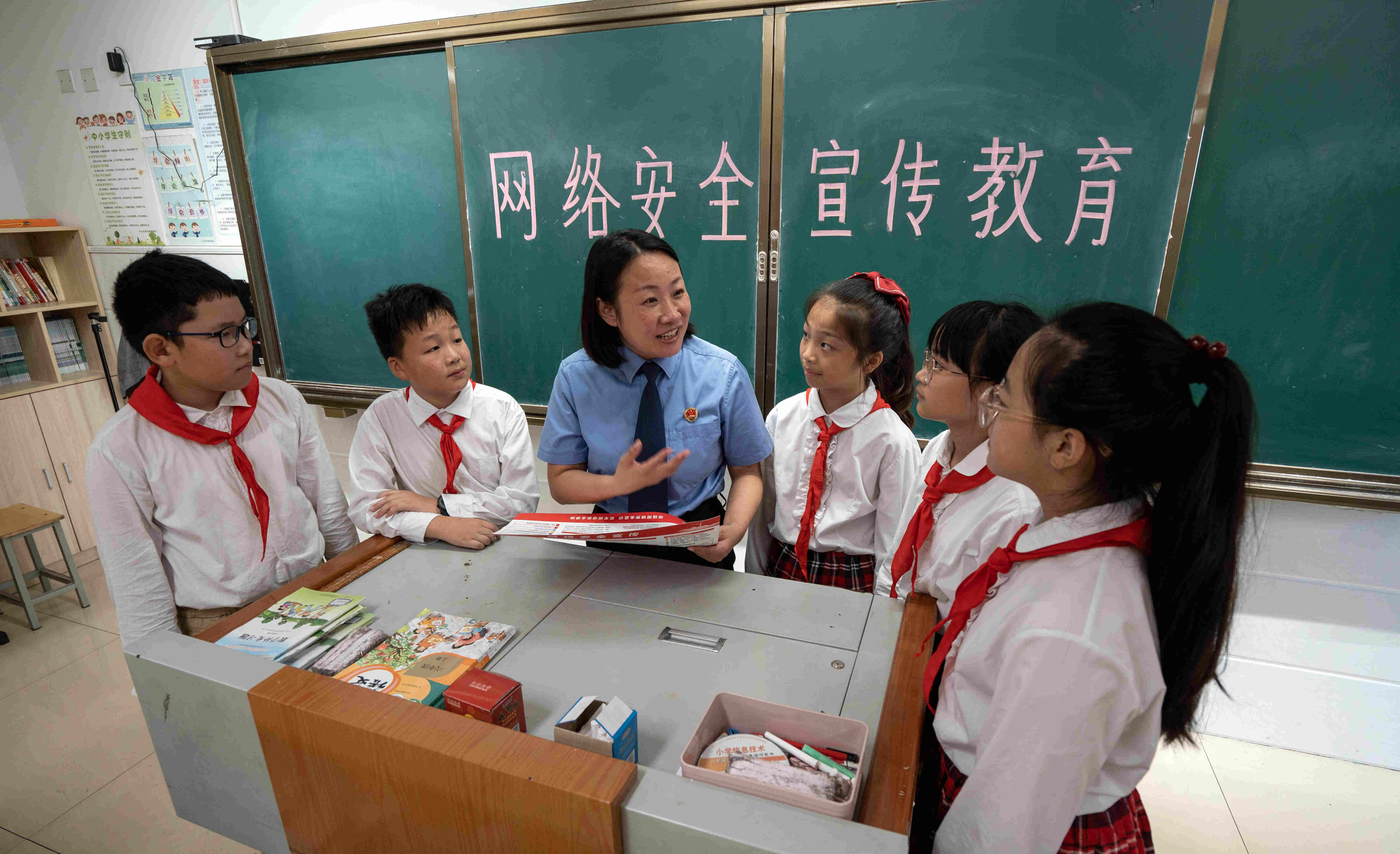 江苏省兴化市人民检察院未成年人法治宣讲团的工作人员走进兴化市文峰小学,通过讲故事、知识问答等方式给学生讲解网络安全知识。