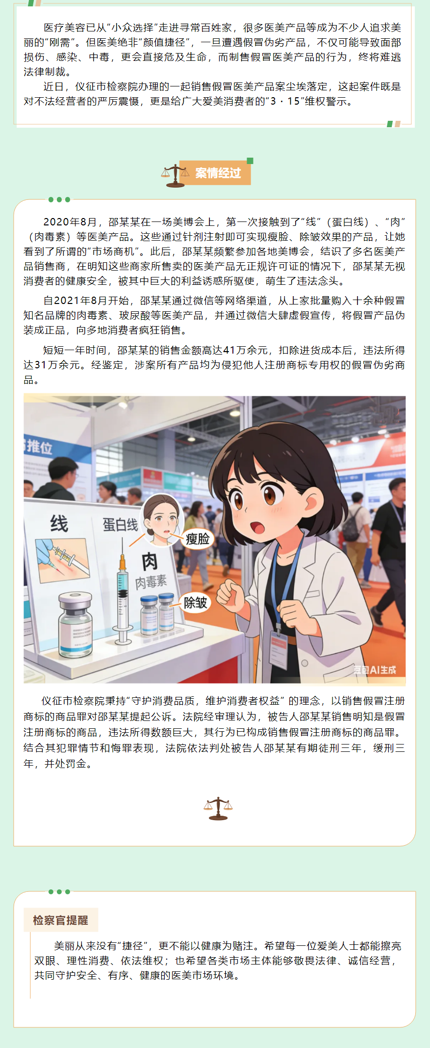 这起案件就像一面镜子,照出了不法之徒以“美”为名的丑陋操作。当然,也不是所有的特价都是骗局,在此提醒消费者:在追求美的同时更应擦亮眼睛,保持理性,一旦发现商家的侵权或违法行为,果断报警或向相关市场监管部门反映,营造诚信公平的消费环境,每个人都应该行动起来。