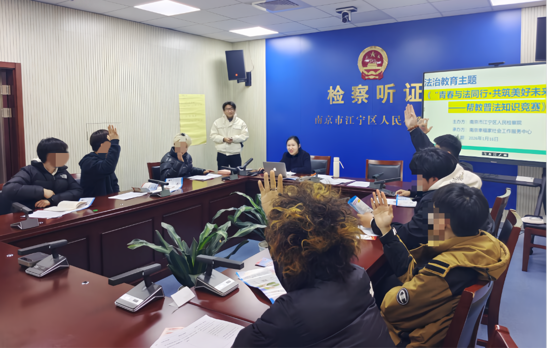 为进一步深化涉罪未成年人司法保护,引导其筑牢法治观念,近日,江苏省南京市江宁区检察院携手南京幸福家社会工作服务中心,举办了以“青春与法同行 共筑美好未来”为主题的帮教普法知识竞赛。活动采用“先学后赛、以赛固学”模式,组织7名涉罪未成年人开展沉浸式学习与互动式竞赛。