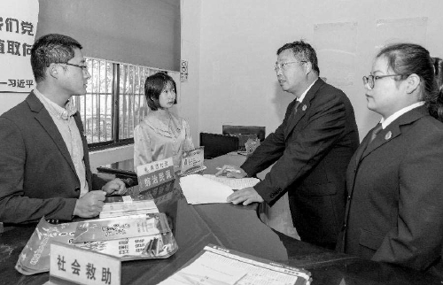 检察官与民政部门工作人员沟通社会化救助帮扶措施。