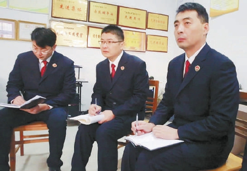 饶本东(中)与同事一起到村委会调查取证