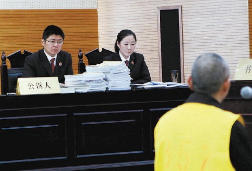 饶本东(左)出庭公诉一起职务犯罪案