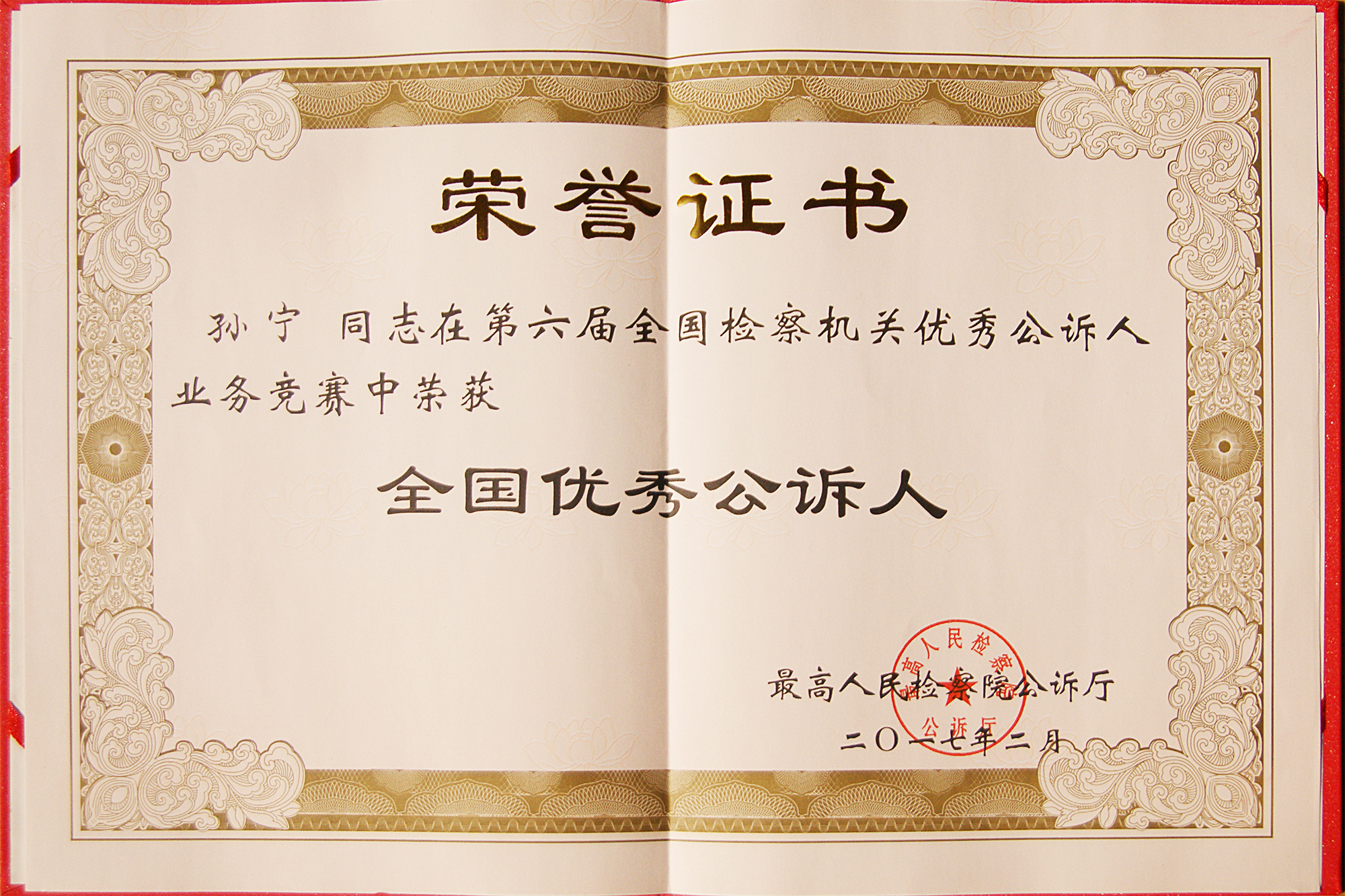 他刻苦钻研、勤学善思,给自己制定细到每一天的奋斗目标,力求在平凡的岗位上做出不平凡的业绩。他很快成长为一名法学功底扎实、法律素养高、实践经验丰富的检察官,在从检十几年的职业生涯中收获了“全国优秀公诉人”、全省“十佳公诉人”等荣誉……