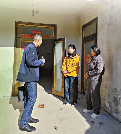 谢共祥(左)来到连云港市赣榆区小河村,了解两名未成年司法救助对象的近况。为了让姐弟俩感到自然,谢共祥特意换上了便装。图为在小河村妇女主任陈潇(右)的陪同下,姐姐妮妮(中)与谢共祥交谈。
