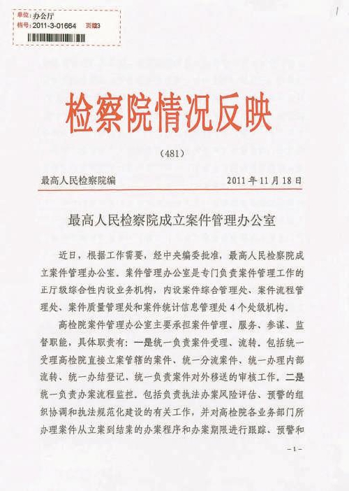 为进一步加强对案件办理工作的监督管理,2011年10月,最高人民检察院成立案件管理办公室,作为专门负责案件管理的综合性业务部门。自2012年1月开始,最高人民检察院对直接办理的案件实行统一、集中管理,并指导地方检察机关建立健全案件管理工作机制。地方各级检察院相继成立案件管理机构,对所办案件实行统一严格的流程管理和动态管理。2012年2月,最高人民检察院印发《最高人民检察院案件管理暂行办法》,进一步规范司法办案活动管理,强化内部监督制约。加强案件管理工作是检察工作机制改革的一项重要内容,对于提高检察机关管理科学化水平,促进司法办案规范化,提高办案质量和效率,促进严格执法公正司法具有重要意义。