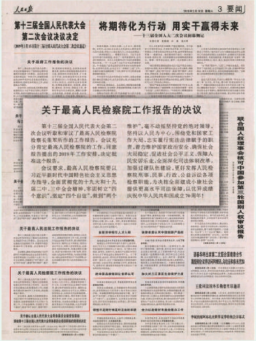 《人民日报》刊登第十三届全国人民代表大会第二次会议关于最高人民检察院工作报告的决议