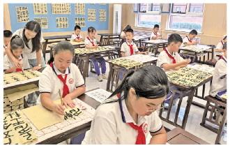 图为九月十一日,新疆维吾尔自治区哈密市豫哈第三实验学校学生在宽敞整洁的书法教室里临摹学习书法。