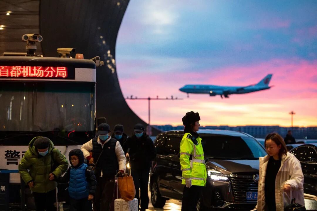 首都机场公安局北京首都国际机场分局交警支队民警在航站楼前指挥疏导交通。