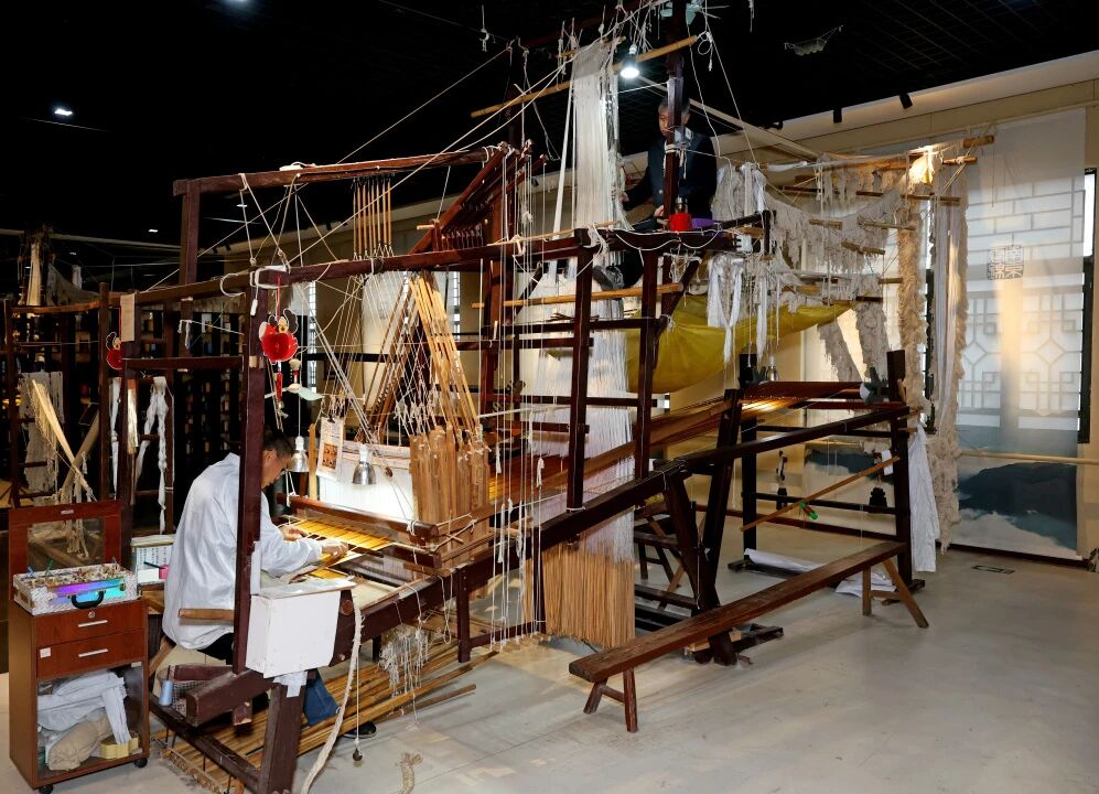 在生产工艺展示大厅,十余台大花楼木织机活态展演。织机高4米,需提花工与织造工两人上下配合,一天仅能织出5至6厘米。这种“通经断纬”的技艺至今无法被机器替代,堪称“寸锦寸金”。从活态技艺到多元织锦文化,这座博物馆让云锦“活”了起来,也让参观者深刻体会到保护这份非物质文化遗产的使命与责任。